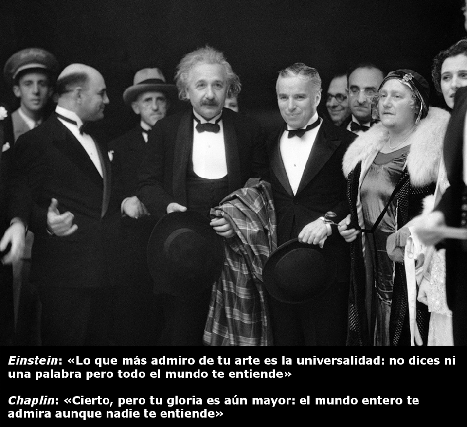 Exaltado el de la chaqueta apretada exclama ya se quien eres tu, eres Albert Einstein el hombre que creó la teoría de la relatividad que al principio nadie creía, ahora que te veo bien tu eres Charles Chaplin que haces así vestido y para colmo llevas un bastón esta es mi ropa de trabajo un poco ridícula y al mismo tiempo risible.